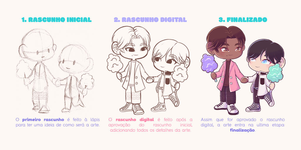 ◇ Leia atentamente todas as informações antes de realizar seu pedido.◇ Todos os pedidos são apenas para uso pessoal (como foto de perfil, capa de redes sociais, wallpaper, quadro para casa, etc.). Para pedidos de uso comercial, envie um e-mail com a sua proposta e discutiremos valores.◇ Não retire meus créditos em nenhuma hipótese, e não corte o logo da arte.◇ Você pode optar por fazer o pagamento em duas vezes. 50% do valor antes do pedido começar e 50% antes da entrega do pedido.◇ Irei começar a trabalhar em seu pedido após o primeiro pagamento, seguindo a ordem de pagamento entre os pedidos.